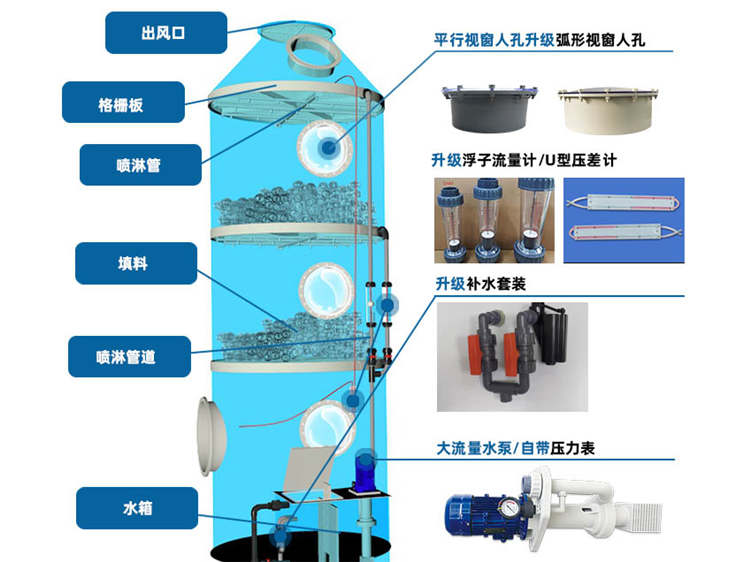 PP噴淋塔也叫做PP洗滌塔、酸霧凈化塔–酸堿廢氣處理設(shè)備;噴淋塔工作原理:噴淋塔主要的運作方式是廢氣由風(fēng)管引入凈化塔,經(jīng)過填料層,廢氣與吸收液進(jìn)行氣液兩相充分接觸吸收中和反應(yīng),酸霧廢氣經(jīng)過凈化后,再經(jīng)除霧板脫水除霧后由風(fēng)機(jī)排入大氣。吸收液在塔底經(jīng)水泵增壓后在塔頂噴淋而下,之后回流至塔底循環(huán)使用。凈化后的酸霧廢氣達(dá)到地方排放標(biāo)準(zhǔn)的排放要求,低于國家排放標(biāo)準(zhǔn)。噴淋塔的結(jié)構(gòu)組成:酸堿廢氣塔分單塔體和雙塔體以及立式噴淋塔與臥式噴淋塔。用法蘭分段連接而成。具體由貯液箱、塔體、進(jìn)風(fēng)段、噴淋層、填料層、旋流除霧層、出風(fēng)錐帽、觀檢孔等組成。
